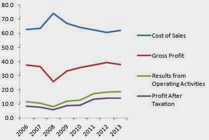 As a % share of revenue, 2006-2013. Information from company annual reports |