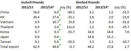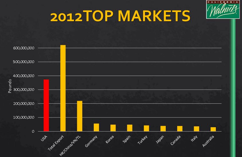 The key reason is rising China’s walnut import from the Central Asian country of Kyrgyzstan in 2013 for low value walnuts. Kyrgyzstan became the largest walnut exporter to China in 2013, overtaking the US, in terms of volume. The US continues to be the biggest walnut exporter by value, according to China customs. statistics.