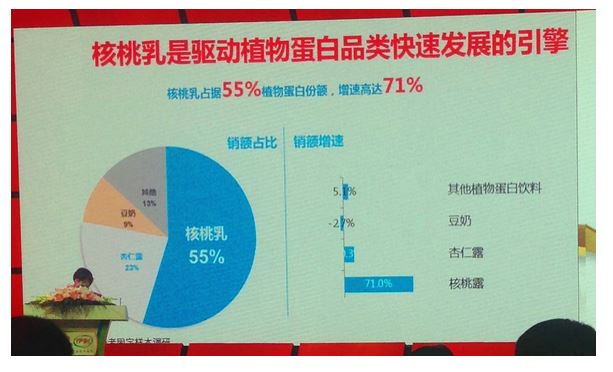 At the Yili’s new product launch ceremony, the company has identified walnut milk as the fastest growing category in the plant protein drink market in China with a 55% share of the market and a 71% growth rate. Apricot kernel drink (杏仁) accounts for 23% of the market, soybean at 9% declining by 2.7% and others at 13% expanding by 5.1%