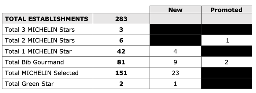 - The eighth edition of the MICHELIN Guide Singapore awards 3 three MICHELIN Stars, 6 two MICHELIN Stars, and 42 one MICHELIN Star