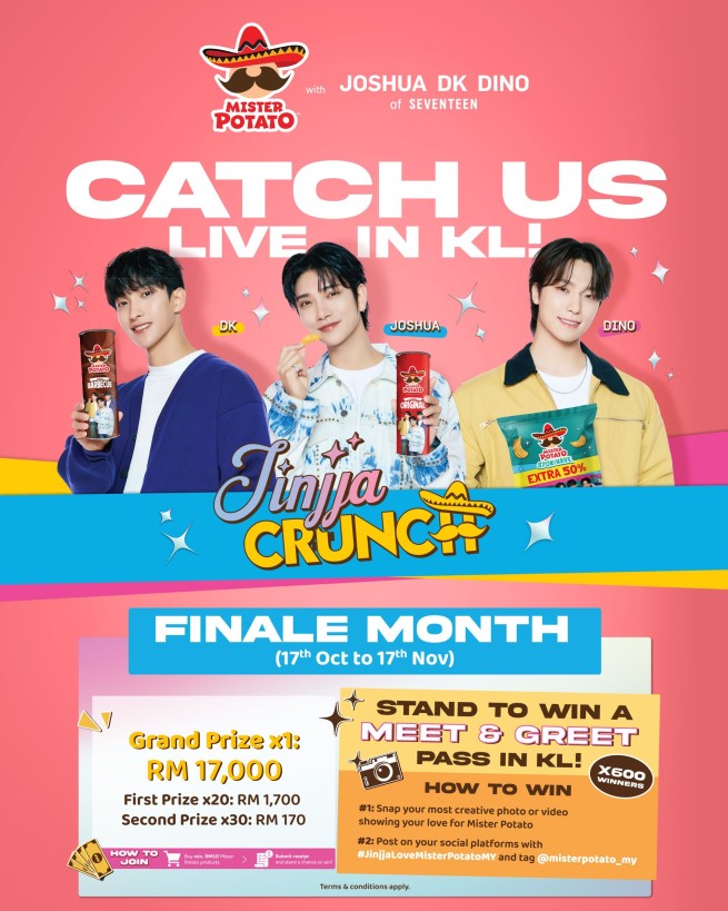 Mister Potato is current having the #JinjjaCrunch contest with a chance to win cash prize of up to RM 17,000 plus a chance to win exclusive Meet & Greet pass to meet JOSHUA, DK & DINO in KL.