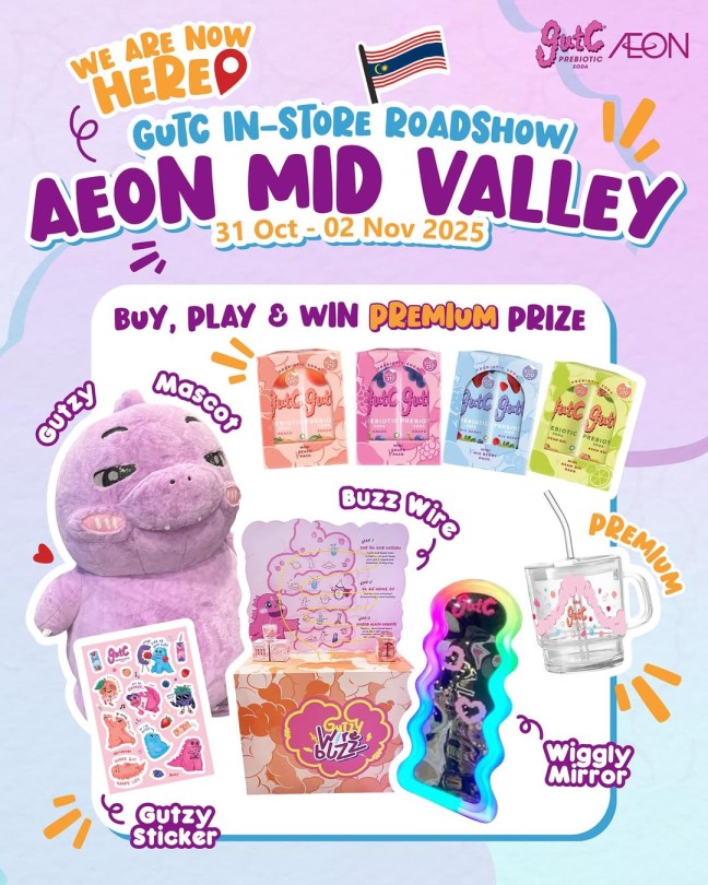 The gutC x Aeon MidValley In-Store Roadshow is currently underway at Aeon Mid Valley, offering an engaging experience for health-conscious visitors. Attendees can enjoy interactive activities, meet the gutZy mascot, and stand a chance to win exclusive premium prizes while sampling the refreshing gutC range.