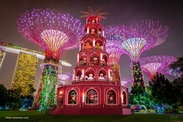 A magnificent 16-metre-tall Christmas Pyramid will make its Singapore premiere at the Supertree Grove. Inspired by traditional yuletide decorations found in festive markets across Germany, this six-tiered rotating structure is home to enchanting characters such as elves, snowmen, and gingerbread men.