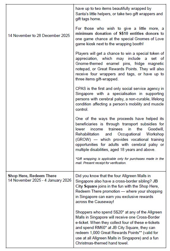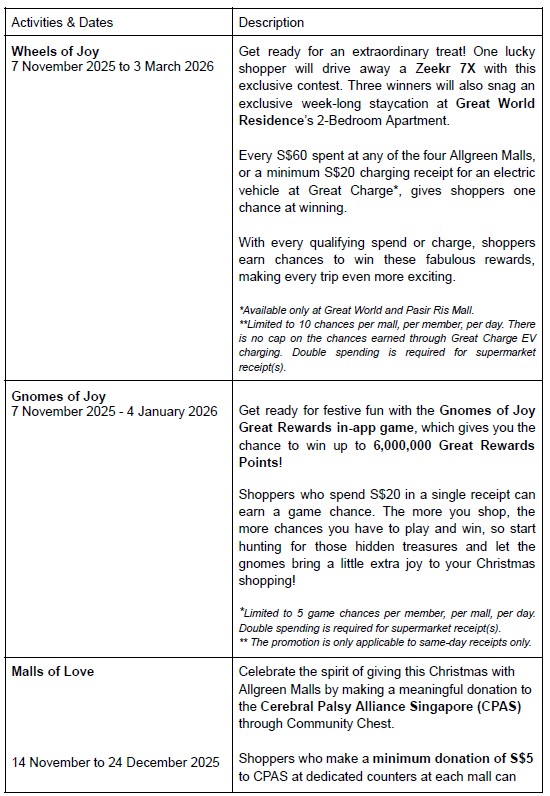 Singapore, 6 November 2025 – Step into a world of wonder and rewards with an exciting line-up of Christmas promotions that spans across all four iconic Allgreen Malls!