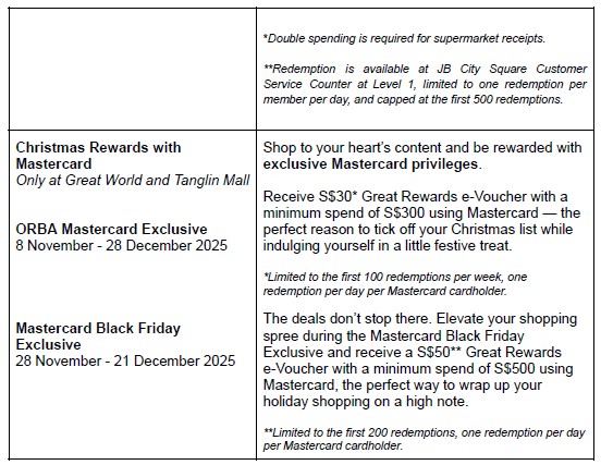 Great Rewards is making it even more rewarding to share the joy of giving this season. From 10 November to 31 December 2025, members can invite others to sign up using their referral code, and once the new member spends at least $20 in any of the four Allgreen Malls, uploads their receipt and has it approved, both will earn 888 Great Rewards Points!