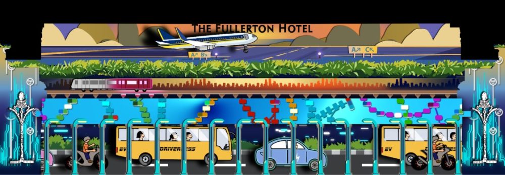 ‘Future Takes Flight’ by Koh Jun Kai is the final artwork of the commissioned series, a piece that envisions a harmonious future where people, nature and technology coexist. Through a lively reimagining of Singapore’s familiar sights into his playful and abstract style, Jun Kai paints a picture of a forward-looking city that is alive with innovation, creativity, and common purpose.