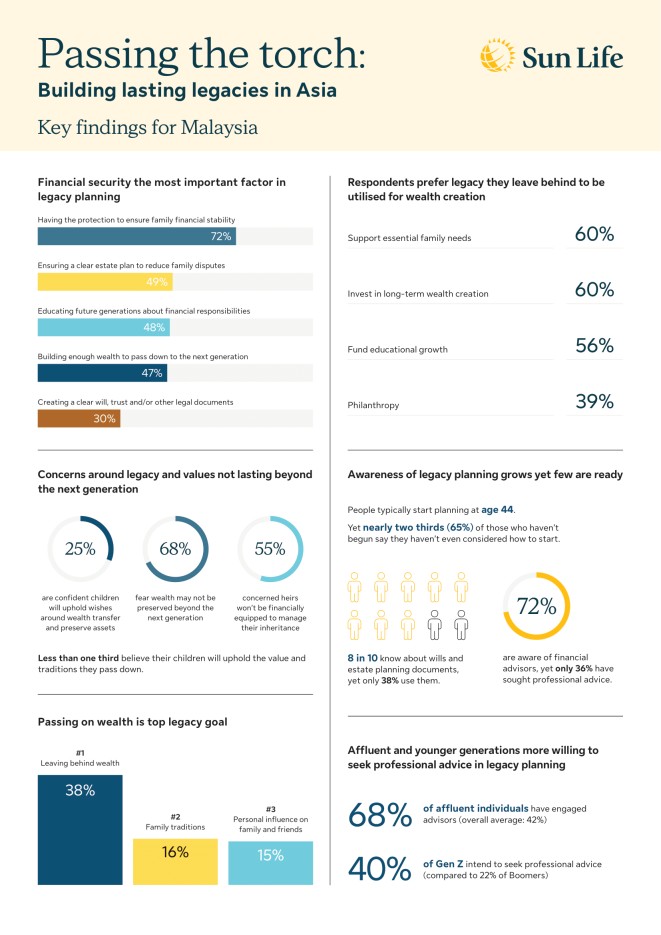 Mr Ho Teck Seng, President and Country Head of Sun Life Malaysia, said: “In Malaysia, we’re witnessing families redefine what legacy truly means – moving beyond financial assets to embrace a more holistic approach that includes financial security, education, and meaningful living for future generations. Our findings reveal a significant gap between intentions and implementation, highlighting the importance of early planning, proper guidance, and open conversations within families to ensure that both wealth and values endure through generations.”