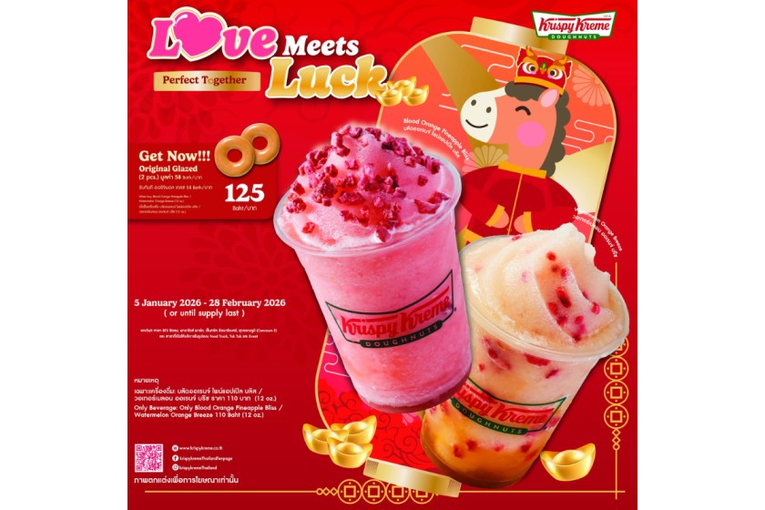 Enjoy Love Meets Luck Perfect Together at THB 110 (12 oz). Special offer: buy any drink from the series for THB 125 and receive two Original Glazed donuts free. Available 5 January – 28 February 2026 at participating Krispy Kreme stores nationwide (excluding carts, food trucks, and box shops).