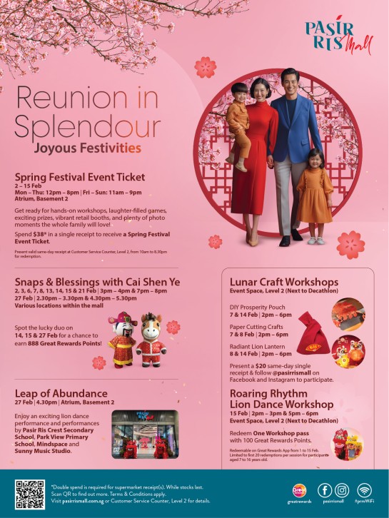 This Chinese New Year, Pasir Ris Mall invites families to celebrate at the Spring Festival Event at the B2 Atrium, featuring interactive game booths with prizes to be won, a dress-up corner for kids, and hands-on cultural workshops. Shoppers can also take part in Lunar Craft Workshops, meet and snap photos with Cai Shen Ye and his trusty steed, and redeem exclusive Prosperity Chopsticks with any qualifying spend, promising a joyful and memorable festive season.