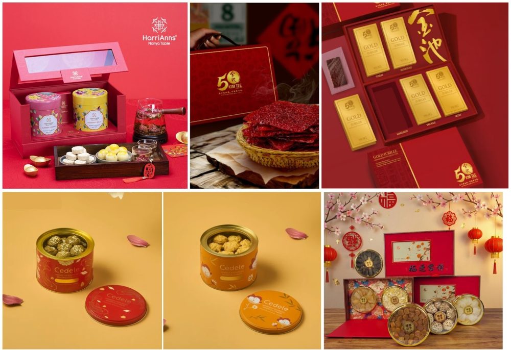 [Clockwise from top left] HarriAnns Prosperity and Harmony Set, Kim Tee Bak Kwa and 50th Anniversary Special Gold Jubilee Commemorative Collection set, Lao Ban Niang Premium Festive Products, Cedele Lemongrass Pistachio and Black Sesame Crunch Cookies