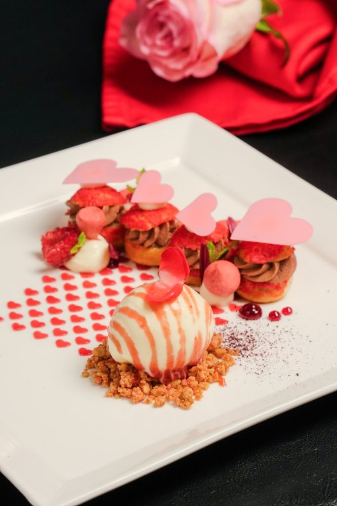 Then indulge in our sweet treat, Chocolate Heart Choux, which comprises delectable mini choux puffs filled with smooth chocolate cream and served with vanilla gelato atop a bed of crumble.