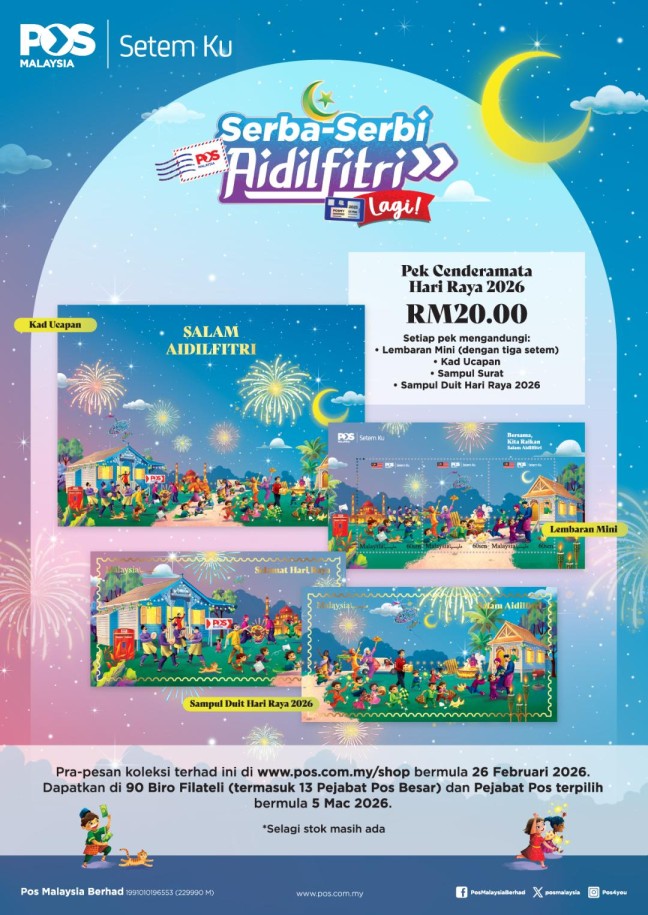 The Hari Raya 2026 Special Pack, priced at RM20, carries a festive design adapted from this year’s Sampul Duit Raya key visual, and extends the narrative into an elegant keepsake for collectors. Each pack includes a miniature sheet with three 60‑sen stamps, a greeting card, an envelope, and two complimentary Sampul Duit Raya in two unique designs. Pre-orders begin on 26 February via the Pos Malaysia online store, with availability at selected Post Offices starting 5 March.