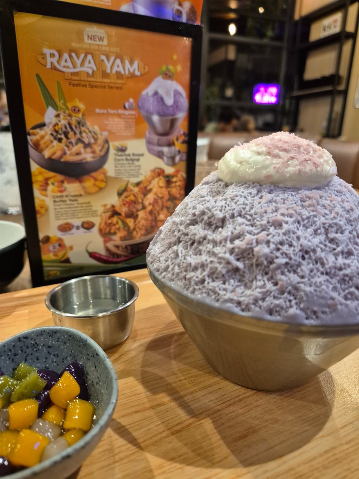 A refreshing taro‑flavored bingsoo topped with cream cheese and taro dust, filled with taro chunks, chewy taro mini balls, and sago pearls. A cooling dessert to end the night on a sweet note.