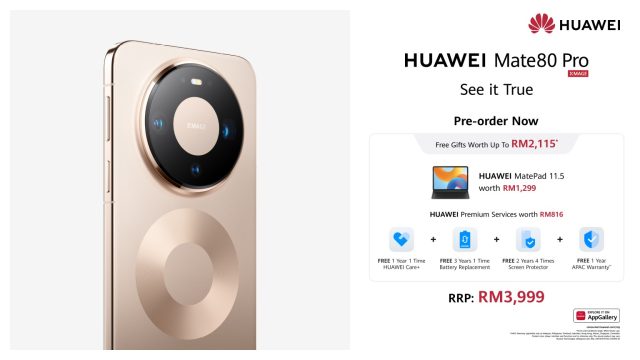 Consumers can now pre-order the HUAWEI Mate 80 Pro retailing at RM3,999 at any HUAWEI Experience Stores, the HUAWEI Official Website, HUAWEI Official Store on Shopee, HUAWEI Flagship Store on Lazada, and the HUAWEI Official TikTok Shop and receive complimentary gifts worth up to RM2,115, including the HUAWEI MatePad 11.5 and HUAWEI Premium Services, which include complimentary One Year Huawei Care⁺ (valid for one claim), Three Years Battery Replacement (valid for one claim), Two Years Screen Protector (valid for four claims) and One Year APAC Warranty.