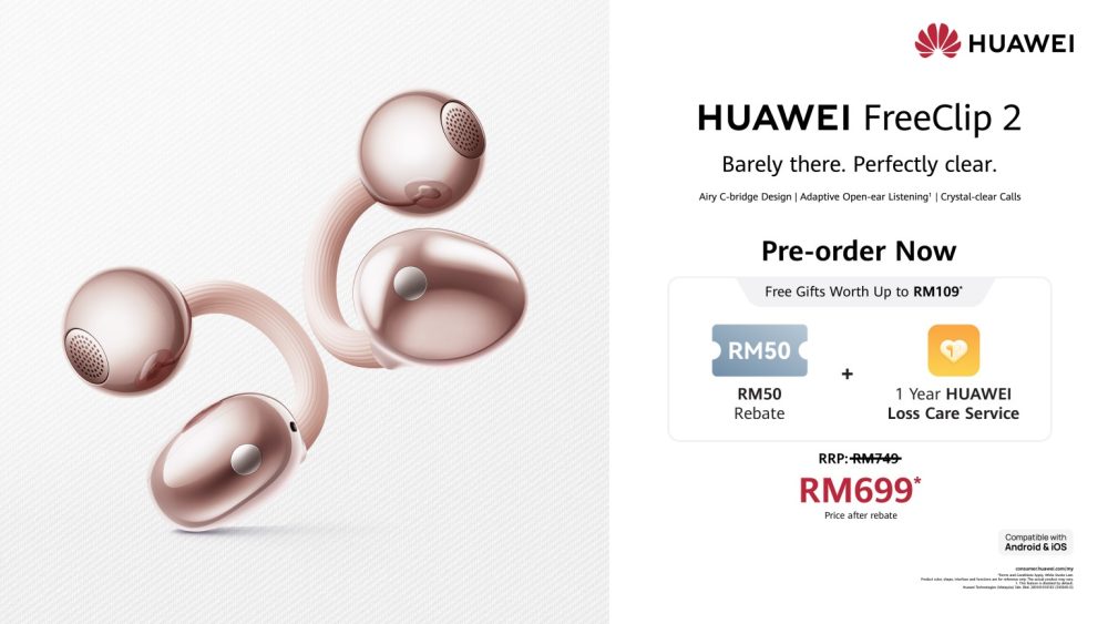 Completing the lineup is the HUAWEI FreeClip 2 in Rose Gold, offering Huawei’s distinctive open-ear design that prioritises comfort and stability. With its signature “Never Feel, Never Fall” wearing experience, the device allows users to enjoy audio throughout the day while maintaining awareness of their surroundings. The HUAWEI FreeClip 2, priced at RM749, is now open for pre-orders with a rebate worth RM50 and one year of Loss Care protection worth RM59.