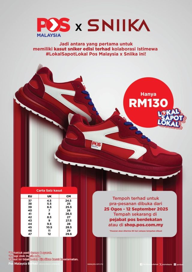 The exclusive sneakers, priced at RM130, is available for pre-order from 25 August to 12 September 2025, with orders ready for collection starting 25 November 2025. Customers can pre-order the limited-edition sneakers online at https://shop.pos.com.my/ or visit any Pos Malaysia outlet nationwide during the pre-order period.Â